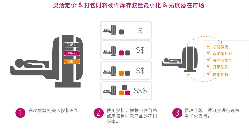 當(dāng)您將功能級(jí)授權(quán)以及打包能力搭建到硬件產(chǎn)品目錄中時(shí),即可真正提升單個(gè)硬件設(shè)備在大量多樣化市場(chǎng)中的總體可用性。停用或移除“基本”版本設(shè)備的高級(jí)功能意味著能以更低的價(jià)格提供該設(shè)備,從而贏得低端市場(chǎng)?;蛘撸O(shè)備供應(yīng)商也可以對(duì)一些為高端客戶或縫隙市場(chǎng)提供附加價(jià)值的高級(jí)功能收取額外費(fèi)用。有一點(diǎn)是確定無(wú)疑的,醫(yī)療設(shè)備供應(yīng)商若不具備將硬件及解決方案各項(xiàng)功能貨幣化的能力,其市場(chǎng)適用性或產(chǎn)品定價(jià)會(huì)受到極大限制,這也等同于喪失了收入機(jī)會(huì)。
