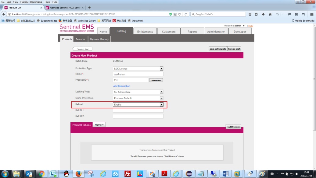 (c、 )去 EMS 里邊Entitlement 標(biāo)簽頁下,像正常升級(jí)加密鎖一樣的標(biāo)準(zhǔn)步驟進(jìn)行操作。新建 Entitlement,然后Entitlement type選擇中間的Product Key,添加上剛才定義的產(chǎn)品testRehost,然后點(diǎn)擊 Produce,接著 Activate。