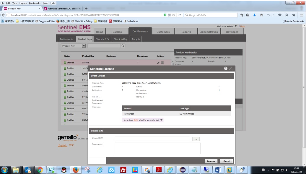 在Generate License窗口中,Upload C2V選擇之前A電腦上需要升級(jí)的SL產(chǎn)生的testRehost.c2v文件。然后點(diǎn)擊 Generate產(chǎn)生對(duì)應(yīng)的v2c 升級(jí)文件。
